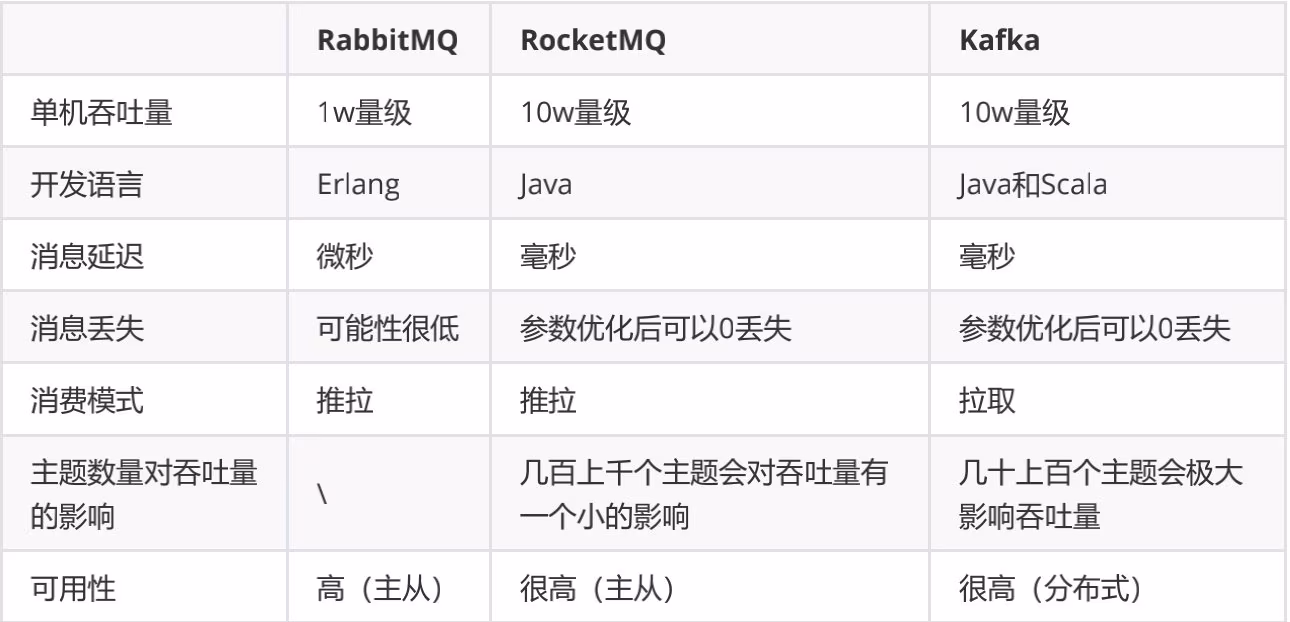 中小型公司 ,技术实力较为一般,技术挑战不是特别高,用 RabbitMQ (开源、社区活跃)是不错的选择; 大型公司,基础架构研发实力较强,用 RocketMQ (Java二次开发) 是很好的选择。