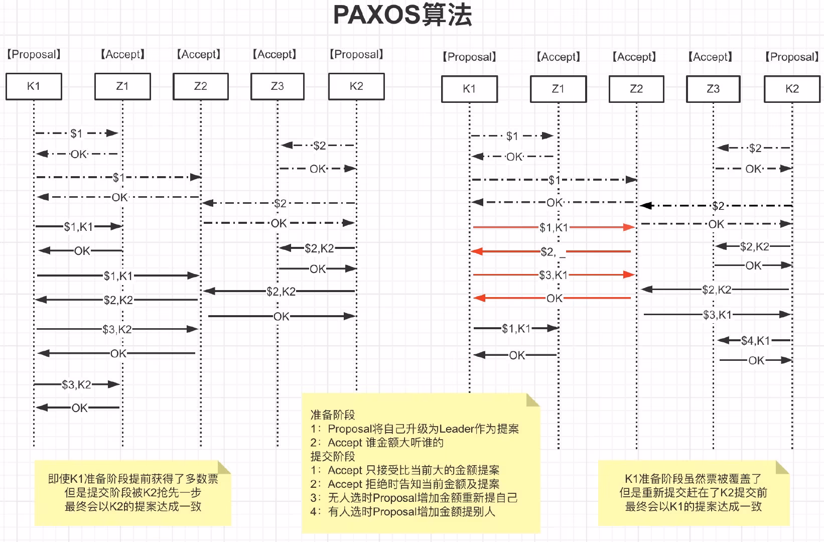 //考虑到半数以上才作数,一个Accpter得接受多个相同v的提案P2a:如果某个v的提案被accept,那么被Acceptor接受编号更高的提案必须也是vP2b:如果某个v的提案被accept,那么从Proposal提出编号更高的提案必须也是v